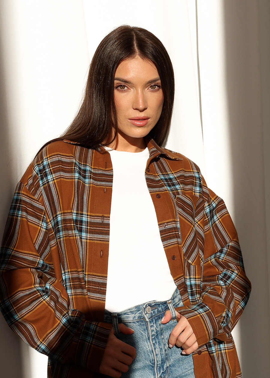 Koszula Sunday o miękkim, oversize’owym kroju. Uszyta z otulającej bawełny, w ciepłej palecie karmel, brązu i subtelnego błękitu. Do jeansów, legginsów, marynarki, sneakersów, kozaków — sprawdzi się w każdej stylizacji. Oversize, ale lekka. Miękka, ale trzyma formę. Premium basic, który żyje z Tobą. Niezastąpiona w codzienności, noszona sezon po sezonie. Ułożenie wzoru kraty może różnić się między egzemplarzami. Zdjęcia mają charakter poglądowy.